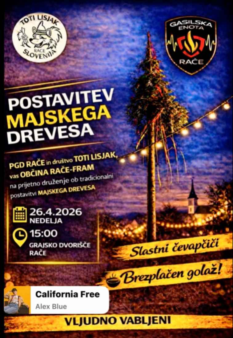 PGD Rače in društvo TOTI LISJAK v sodelovanju z Občino Rače–Fram vabimo vse krajanke, krajane in prijatelje dobre volje, da se nam pridružite na tradicionalni postavitvi majskega drevesa, ki bo potekala: