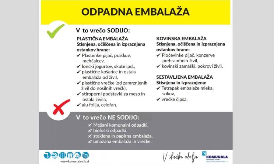V jesenskem času bo Komunala Slovenska Bistrica pričela z dostavljanjem rumenih vreč, namenjenih zbiranju odpadne mešane embalaže za leto 2023. Deljenje bo potekalo na enak način kot preteklo leto. Ustrezno število rumenih vreč boste do konca leta prejeli na vaš naslov (na čimbolj primerno mesto, varno pred morebitno odtujitvijo).