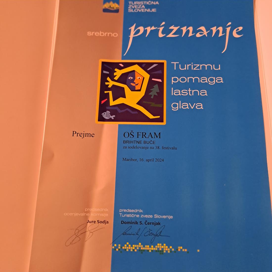 Turistična zveza Slovenije je včeraj, 16. aprila 2024 turističnemu podmladku Brihtne buče iz Osnovne šole Fram in mentoricama Mojci Lešnik in Tatjani Ajd Krampl podelila srebrno priznanje za sodelovanje na 38. festivalu Turizmu pomaga lastna glava.Središče Frama krasi Oljarna Fram - najstarejša slovenska oljarna s 270 letno tradicijo proizvodnje bučnega olja iz domačih semen lastne proizvodnje. Mogočna stavba v središču Frama kot objekt stavbne in tehniške kulturne dediščine je obnovljena in urejena v muzej oljarstva in promocijsko degustacijski prostor s lokalnimi proizvodi ter turistično ponudbo.