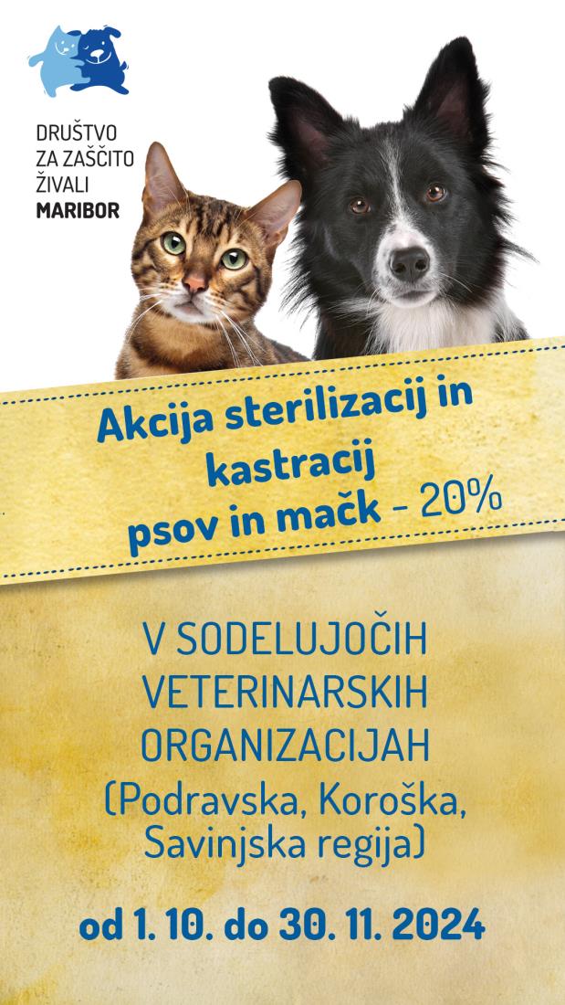 Iz strani Društva za zaščito živali smo bili obveščeni, da je pri vseh sodelujočij veterinarskih organizacijah med 1.10. in 30.11.2024 za storitve sterilizacij in kastracij možno koristiti -20% popusta pri ceni storitve.